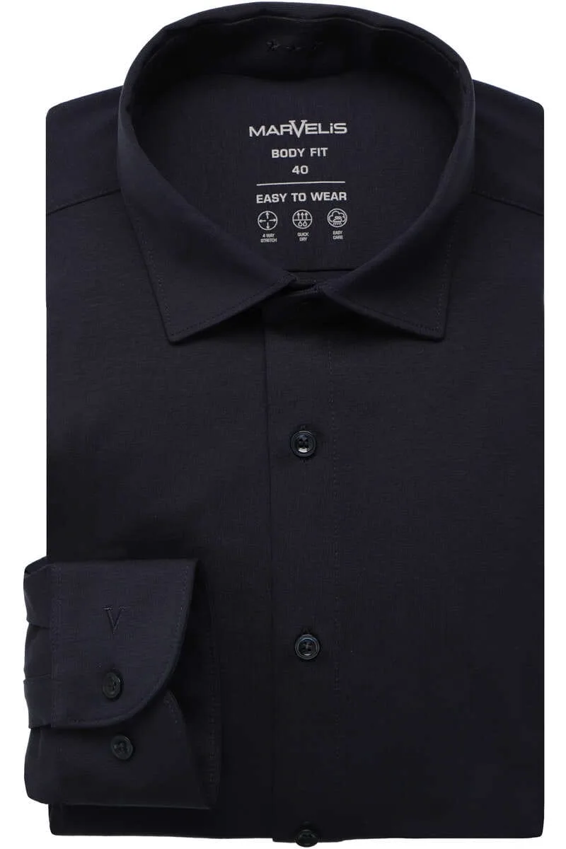 MARVELIS body fit overhemd tricot donkerblauw Strijkvriendelijk Boord