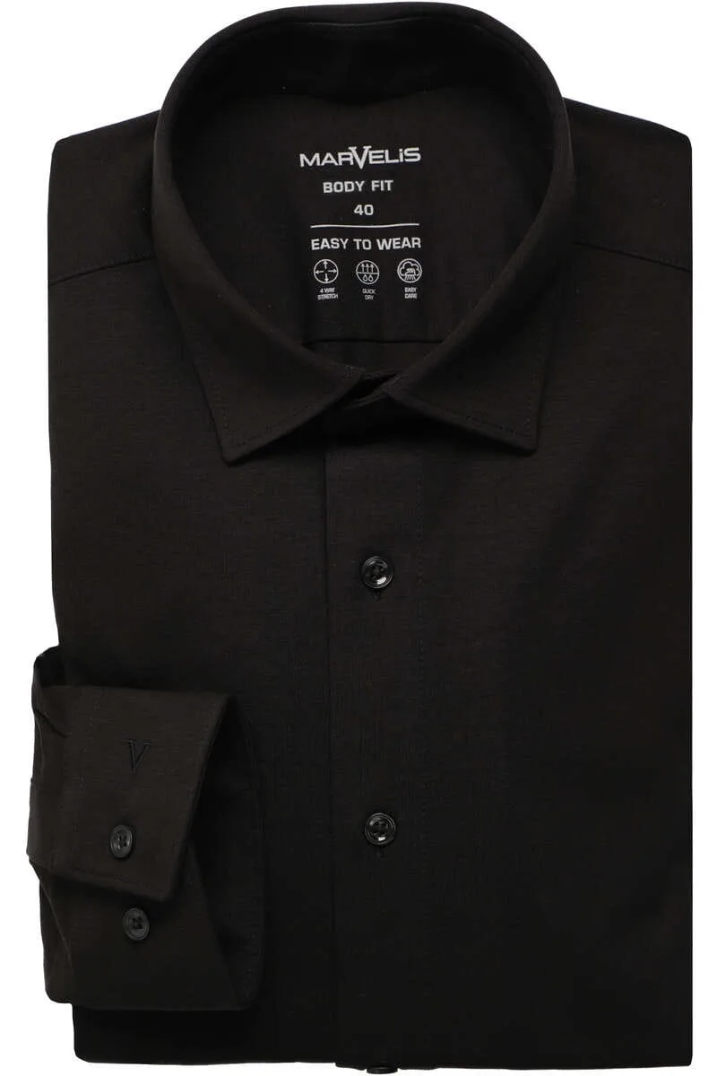 MARVELIS body fit overhemd tricot zwart Strijkvriendelijk Boord