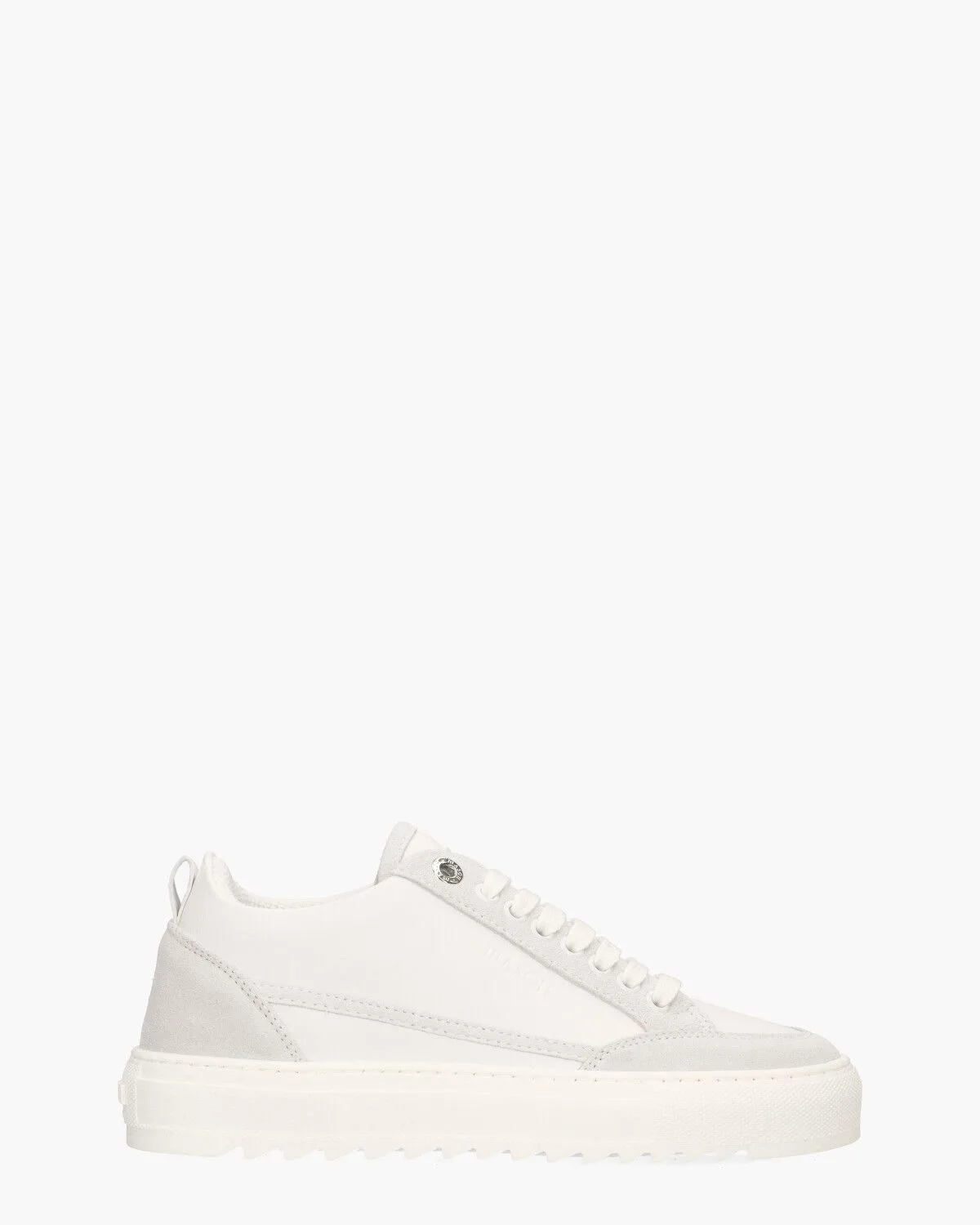 Sneakers voor dames Tia Versatile 5H uit de collectie van het Italiaanse label Mason Garments. Dit model heeft een bovenwerk van zacht wit kalfsleer afgewerkt met off-white suède. De binnenzijde is in soepel leer en mesh uitgevoerd en voorzien van een comfortabel en uitneembaar voetbed. De catchy zilveren eyelets en vetertips vallen meteen