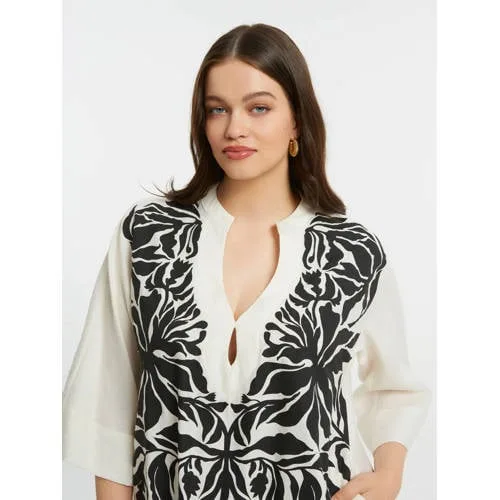 Deze Mat Fashion zomerjurk in grote maten is een praktische keuze voor warme dagen waarop je er verzorgd uit wilt zien zonder veel moeite. De wit/zwarte bloemenprint geeft een heldere, moderne uitstraling en de midi lengte valt rond het midden van het onderbeen. Door de soepel vallende stof volgt de jurk je bewegingen op een subtiele manier, wat prettig is op drukke dagen of tijdens een etentje op het terras.Details die het verschil maken Midi jurk met middel lange lengte, geschikt voor zomerse dagen Half lange, rechte mouwen voor lichte bedekking van de bovenarmen V-hals die het decolleté laat uitkomen zonder te diep te zijn Zonder sluiting, je trekt de jurk eenvoudig over het hoofd aan Wit/zwart bloemenpatroon voor een rustige, vrouwelijke uitstraling Ontwikkeld voor het grote maten assortiment met aandacht voor pasvorm Geen zakken, waardoor de jurk glad langs het lichaam valtComfortabel in elke zomerse settingOf je nu een zomerse werkdag hebt, een dagje weg gaat of een diner plant, deze midi jurk is geschikt voor verschillende situaties. De half lange mouwen en middel lange rok geven voldoende bedekking, terwijl de lichte stof en bloemenprint luchtig en zomers aanvoelen.Mat Fashion: stijl met aandacht voor vormenMat Fashion richt zich op mode in grotere maten, met ontwerpen die trends volgen en tegelijk rekening houden met vrouwelijke vormen. De pasvorm en details zijn doordacht, zodat je je vrij kunt bewegen en je outfit de hele dag goed blijft zitten.Een zomerjurk die praktisch comfort en een verzorgde uitstraling op een toegankelijke manier combineert.