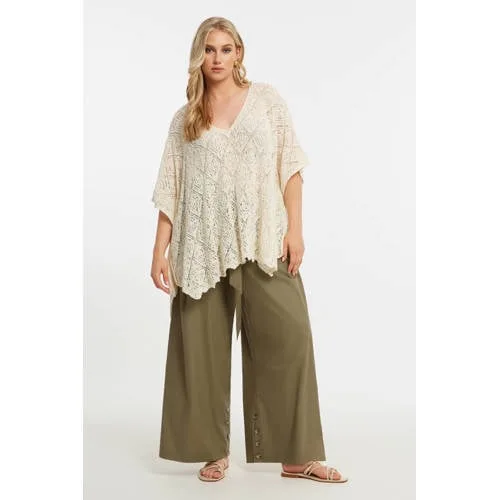 Til je dagelijkse look naar een hoger niveau met deze ecru dames top met kant van Mat Fashion. De top heeft een vrouwelijke V-hals en half lange, rechte mouwen, waardoor de top luchtig en toch bedekkend is. De lichte ecru kleur sluit mooi aan bij het lenteseizoen en laat zich makkelijk combineren met andere items in je garderobe.Verfijnde kantlook in een zachte kwaliteit Gemaakt van 80% katoen / 20% polyamide, voor een zachte touch en vormvast draagcomfort Effen ecru kleur die rust uitstraalt en bij veel andere kleuren past V-hals die het decolleté subtiel accentueert Half lange mouwen met rechte inzet voor een ontspannen pasvorm Kantoptiek die zorgt voor een vrouwelijke, verfijnde uitstraling Onderdeel van het grote maten assortiment, ontworpen met oog voor ruimte en bewegingsvrijheidStijlvol voor alledaags en nette momentenDeze top is een fijne basis voor verschillende gelegenheden. Combineer hem met een lichte jeans voor een casual dag of met een elegante broek of rok voor een meer geklede look. De half lange mouwen maken de top ideaal voor het voorjaar of voor laagjes onder een vest of blazer.Mat Fashion: mode met aandacht voor pasvormMat Fashion richt zich op vrouwen die graag kiezen voor moderne mode in grotere maten, zonder in te leveren op comfort. De collecties worden ontworpen met aandacht voor soepele pasvormen en materialen die prettig aanvoelen. Daardoor zijn de items makkelijk te dragen in het dagelijks leven en blijven ze lang mooi.Een veelzijdige top die comfort en een vrouwelijke uitstraling op een rustige, tijdloze manier samenbrengt.
