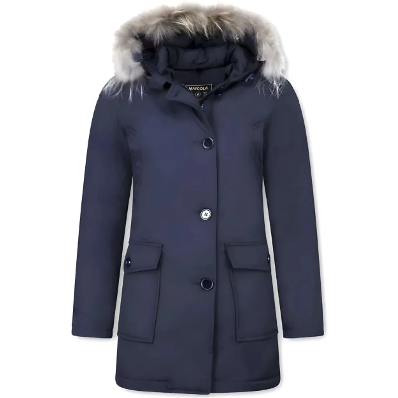 Bontjassen - Dames Winterjas Wooly Lang - Bontkraag - Parka Steekzakken - Blauw - Specificaties:- Kleur: Zie Afbeelding- Lengte: Lang- Pasvorm: Normaal - Sluiting: Rits met Knopen- Materiaal: Polyester- Voering: 75% Polyester 25% Katoen- Lichaam voering: 100% Katoen- Zakken: 2 Jaszakken- Collectie: Winter- Standaard Bontkraag: KLEIN- Bontkraag: Afhaalbaar- Wasvoorschrift: Stomerij- Beschikbare Maten: XS - S - M - L - XL Let op: De bontkraag is een natuurproduct en hierdoor heeft ieder stuk bont zijn eigen unieke uitvoering. Het bont kan dus afwijken in volheid van vacht en in kleur dan op de afbeelding weergegeven.