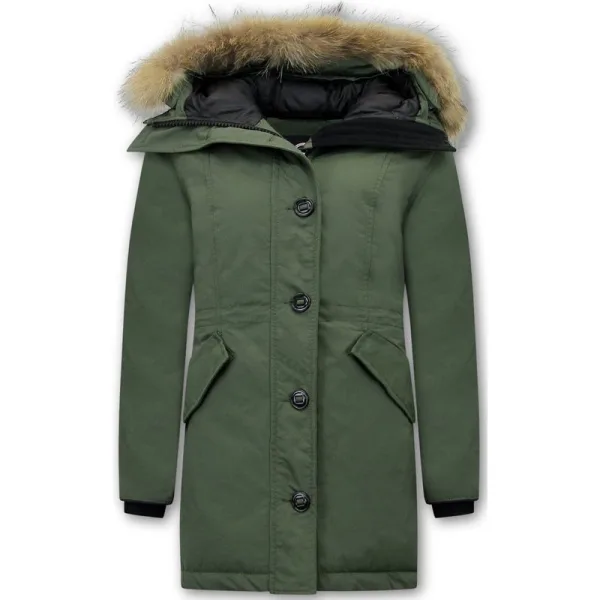 Deze dames winterjas met echte bontkraag is een absolute verschijning en vooral in de kleur groen. De jas sluit prima om uw lichaam door de slim fit pasvorm en houdt uw lekker warm. - Specificaties:- Parka Dames Winterjas met Bontkraag Groot- Kleur: Zie Afbeelding Groen- Lengte: Lang- Pasvorm: Slim fit- Sluiting: Rits met Knopen- Materiaal: 20% Polyester 80% Katoen- Voering: 100% Polyester - Zakken: 2 Jaszakken, 1 Binnenzak- Collectie: Winter, Gewatteerd- Standaard Bontkraag: GROOT- Bontkraag: Afhaalbaar- Wasvoorschrift: Stomerij- Beschikbare Maten: XS - S - M Let op: De bontkraag is een natuurproduct en hierdoor heeft ieder stuk bont zijn eigen unieke uitvoering. Het bont kan dus afwijken in volheid van vacht en in kleur dan op de afbeelding weergegeven.