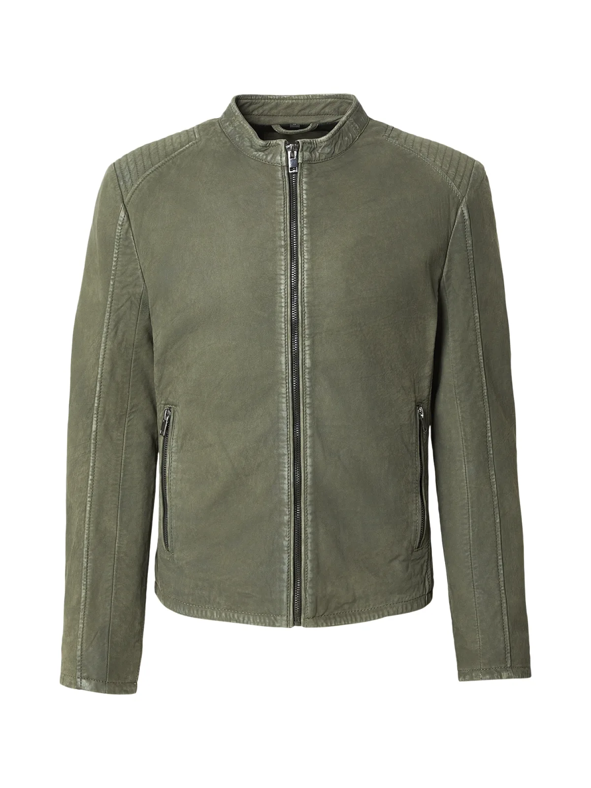Design: Staande kraag, Ritszakken aan de zijkant; Type sluiting: Ritssluiting; Type jas: Bikerjack; Voering: Licht gevoerd; Materiaal: Leer; Motief: Effen; Extra's: Stiksels, Stevige stof; Pasvorm: Normale pasvorm