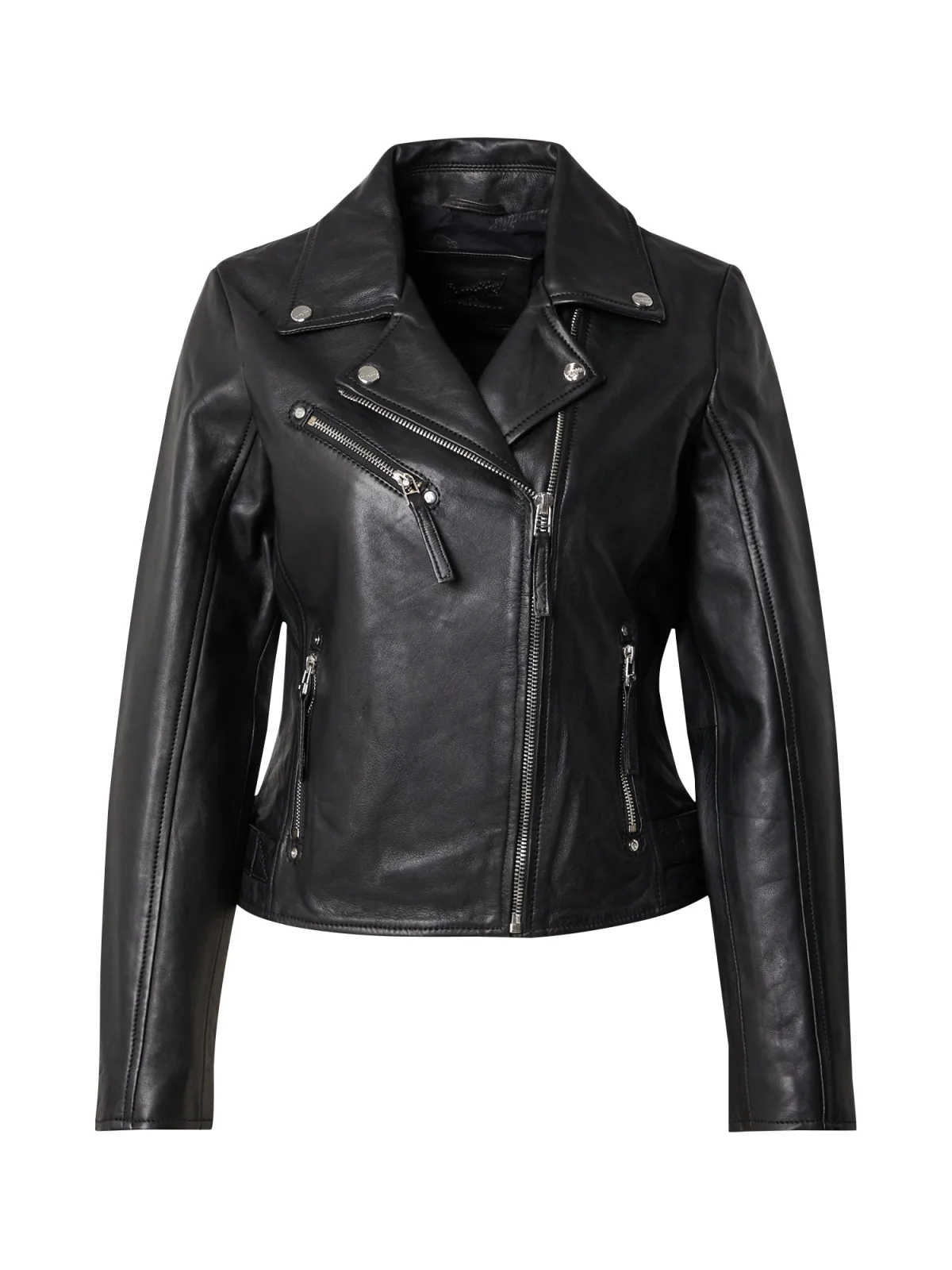 Design: Drukknopsluiting, Mouw rits, Borstzak, Ritszakken aan de zijkant, Verstelbare taille; Type sluiting: Ritssluiting; Type jas: Bikerjack; Voering: Licht gevoerd; Materiaal: Leer; Motief: Effen; Extra's: Label plaatje, Stevige stof; Pasvorm: Slanke pasvorm