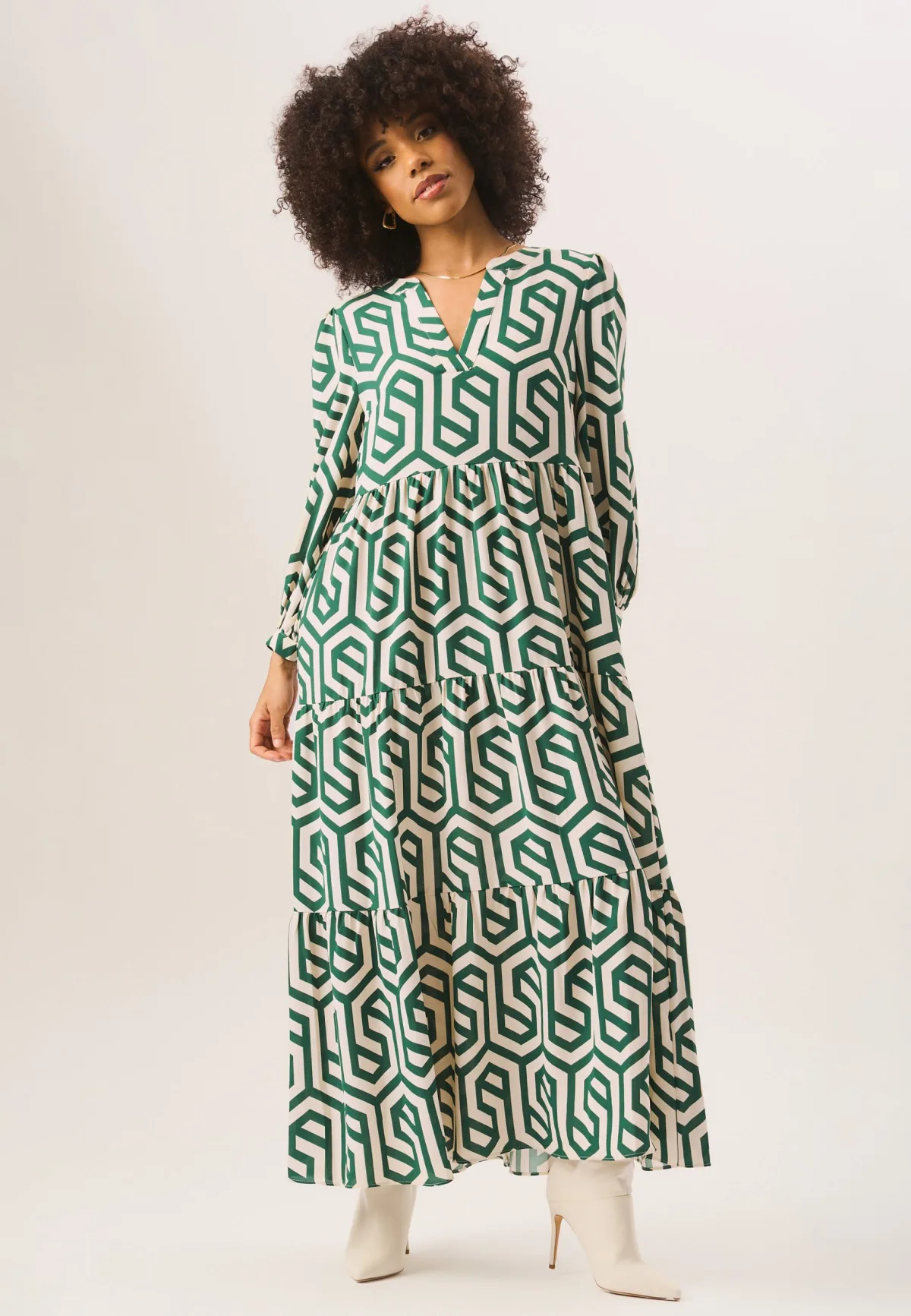 Deze groene geoprint smoke maxi-jurk brengt mode en comfort samen. Deze jurk is gemaakt met een uniek geoprintpatroon en is perfect voor elke gelegenheid. De gesmokte taille zorgt voor een flatterende touch, terwijl het zwierige silhouet zorgt voor een chique en moeiteloze stijl. Geef je garderobe een boost met deze musthave-jurk.