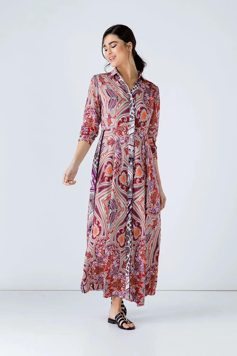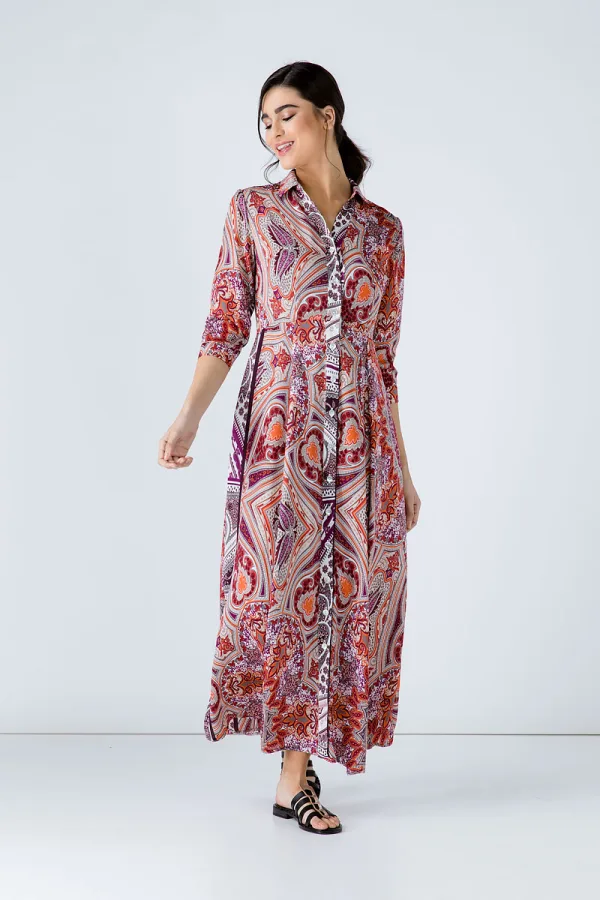 Een maxi-jurk van geweven stof met print. ¾ mouwen met manchetten die sluiten met een knoop. Kraag. Knoopsluiting aan de voorkant met decoratieve knopen van het schelptype. Naad in de taille. Volledige rok tot onder de taille. 2 binnenzakken.
