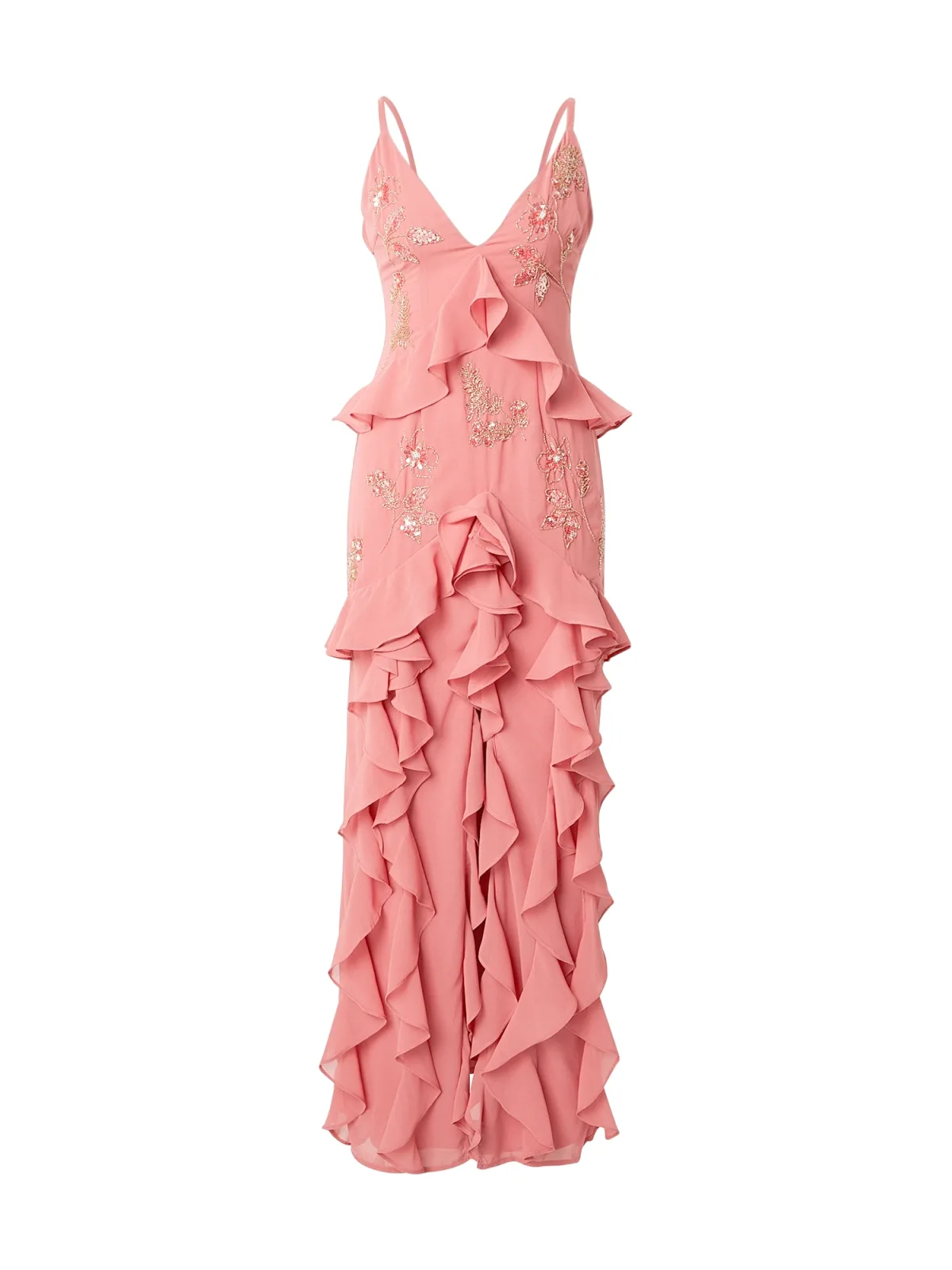 Design: Gevoerde zoom/rand, Rug rits, Diepe snit/decolleté, Uitgesneden rug; Type sluiting: Ritssluiting; Halstype: V-hals; Soort bandjes: Spaghettibandjes; Details: Volant, Gedrapeerd, Parels; Extra's: Applicaties, Op staal naden, Gladde stof; Lengte: Lang/maxi; Snit: Getailleerd; Pasvorm: Slanke pasvorm; Armlengte: Mouwloos