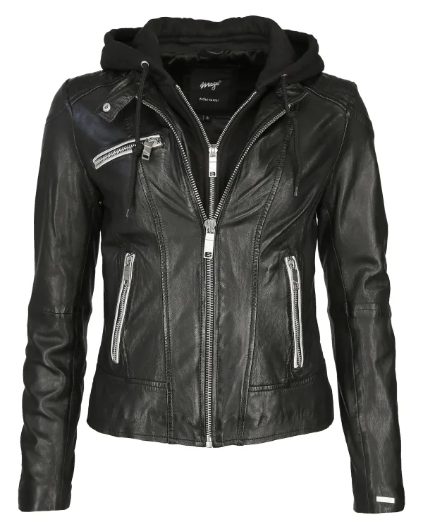 Design: Afneembare capuchon, Capuchon met trekkoord, Gelaagde look, Borstzak, Ritszakken aan de zijkant; Type sluiting: Ritssluiting; Type jas: Bikerjack; Voering: Licht gevoerd; Materiaal: Leer; Motief: Effen; Extra's: Op staal naden, Metalen oogjes; Pasvorm: Slanke pasvorm