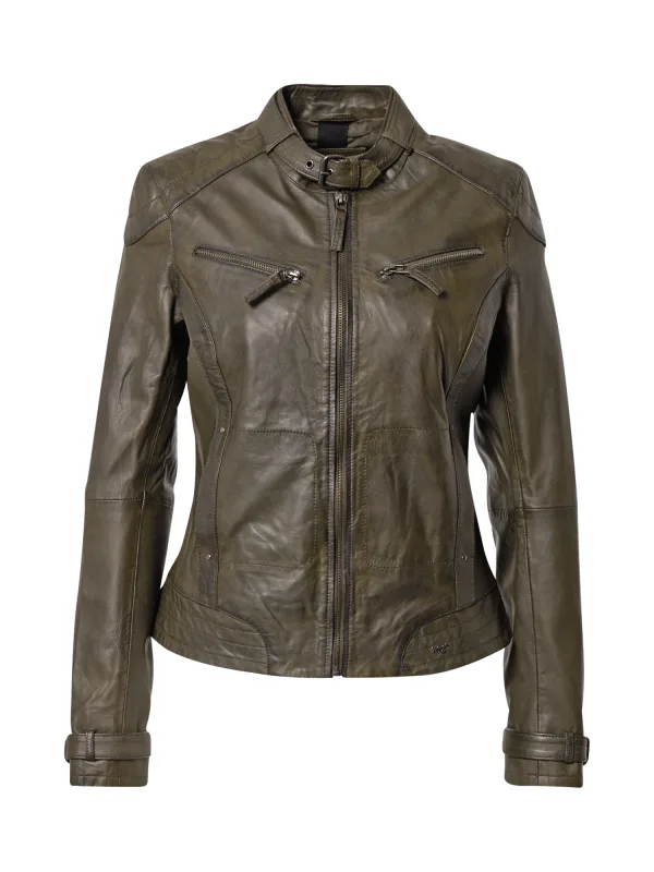 Design: Ritssluiting, Staande kraag, Borstzak, Zakken aan de zijkant, Gesp; Type sluiting: Ritssluiting; Type jas: Bikerjack; Voering: Licht gevoerd; Materiaal: Leer; Motief: Effen; Extra's: Studs, Op staal naden, Gladde stof, Lamsleer; Pasvorm: Normale pasvorm