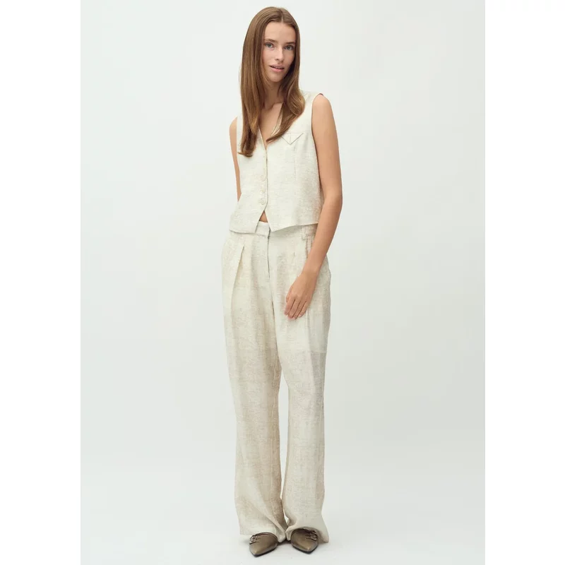 De mbyM Cristiana Long-M broek is een stijlvolle en verfijnde keuze voor elke gelegenheid. Met een subtiele print en een elegante pasvorm combineert deze lange pantalon moeiteloos comfort en mode. De middelhoge taille, vouwplooien en relaxte pasvorm zorgen voor een flatterende uitstraling, terwijl de zijzakken en riemlussen een praktische touch toevoegen. Draag deze veelzijdige broek met een bijpassend gilet voor een stijlvolle co-ord look of combineer het met een basic top voor een casual-chique outfit. Product details: Merk: mbyM Kleur: Beige met print Materiaal: 85% viscose, 15% polyamide (nylon) Voering: 100% viscose Pasvorm: Relaxed fit Taille: Middelhoge taille Lengte: Lang Details: Vouwplooien, zijzakken, riemlussen Het model is 176 cm lang en draagt maat S.
