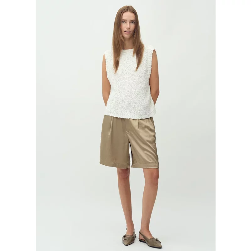 De mbyM Guri-M korte broek in beige satijn is een chique en veelzijdige toevoeging aan je zomergarderobe. Dankzij de subtiele glans van de satijnachtige stof straalt deze short pure elegantie uit. Het model heeft een lichte A-lijn met wijde pijpen voor een comfortabele pasvorm en een flatterend silhouet. De shorts zijn voorzien van riemlussen, zijzakken, een haak- en ritssluiting én geplooide achterzakken voor een verfijnde afwerking. Perfect te combineren met een leuke zomerse top of een luchtige blouse voor een moderne, stijlvolle set. Product details: Merk: mbyM Kleur: Beige Materiaal: 54% polyester, 46% viscose Pasvorm: Relaxed fit Pijpen: Wijde pijpen in A-lijn Sluiting: Haak- en ritssluiting Zakken: Zijzakken & geplooide achterzak Het model is 176 cm draagt maat S