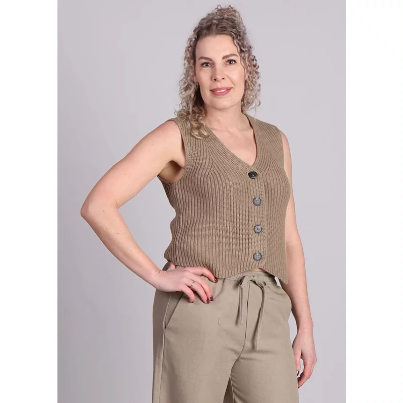 Voeg een vleugje Scandinavische elegantie toe aan je zomergarderobe met het mbyM Ilina-M gilet in een stijlvolle beige tint. Dit gebreide gilet heeft een V-hals en knoopsluiting aan de voorkant. Combineer dit zomerse gilet met een beige broek voor een gave ton sur ton look. Het gilet is de perfecte mix van comfort en stijl en kan moeiteloos over elke outfit gedragen worden op zonnige dagen. Draag dit gilet over een linnen top met een bijpassende beige pantalon voor een elegante zomerlook. Combineer het met een zwierige linnen rok voor een bohemian vibe of met een denim short en sandalen voor een relaxte, city-chic uitstraling. Een veelzijdig item dat perfect is voor de warmere maanden! Product details: V-Hals Knoopsluiting Mouwloos Materiaal: 60% katoen 40% acryl Valt normaal op maat Het model draagt maat S