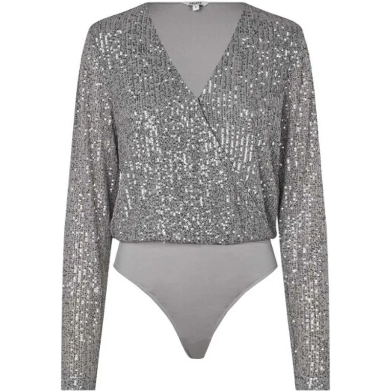Voeg een vleugje glamour toe aan je garderobe met de zilveren pailletten body Lilu van mbyM! Deze schitterende bodystocking met lange mouwen is een absolute showstopper dankzij de glinsterende pailletten. Het wikkeleffect aan de voorkant zorgt voor een vrouwelijke, flatterende pasvorm. De body sluit gemakkelijk aan de onderkant en is perfect om te combineren met een chique broek of rok voor een feestelijke outfit. De elegante zilveren tint laat je schitteren bij elke gelegenheid!
