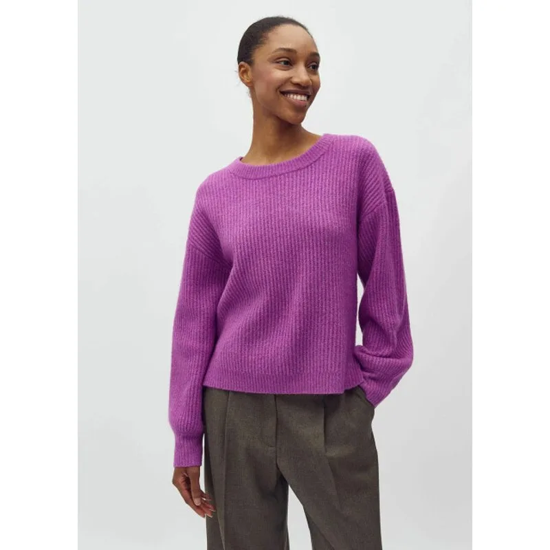 De mbyM Servin-M trui in een opvallende roze tint is een echte eye-catcher voor het najaar. Deze gebreide trui heeft een rechte, iets lossere pasvorm en voelt zacht aan op de huid dankzij de mix van acryl, nylon, elastaan en wol. De brede ronde hals, verlaagde schoudernaden en ballonmouwen geven de trui een nonchalant silhouet dat je zowel chic als casual kunt stylen. Draag 'm op een wijde pantalon voor een moderne look of met een rok voor een vrouwelijke twist. Product details: Merk: mbyM Model: Servin-M Kleur: roze (Cattleya Orchid) Rechte, relaxte pasvorm Brede ronde hals Ballonmouwen met ribboorden Ribgebreide structuur Verlaagde schoudernaden Kleur: felroze Materiaal: 51% acryl, 36% nylon, 7% elastaan, 6% wol Het model draagt maat S/M