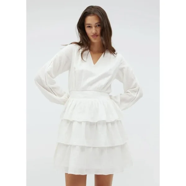 Heerlijk zomers deze off white jurk Faina van mbyM. De geweven off white jurk met smock details in de taille, heeft een elastische tailleband, lange mouwen met opengewerkte details en elastische mouwzoomen. De off white zomerjurk heeft een V-hals. Materiaal: 100% katoen. Voering: 100% viscose.