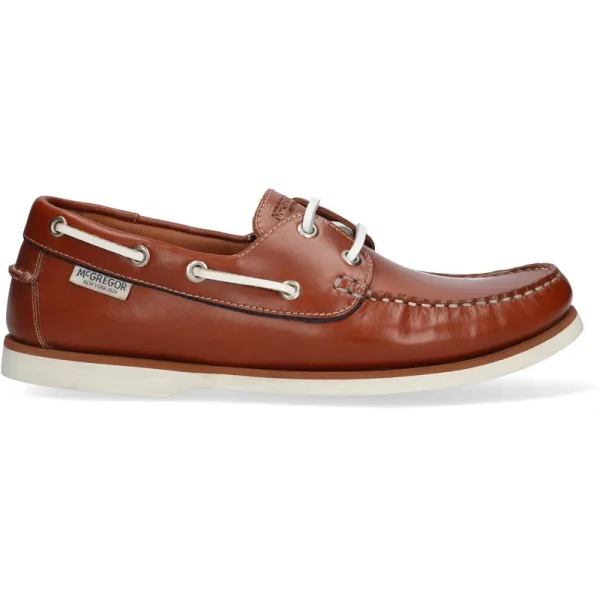 Comfortabele McGregor schoenen in mooie cognac gekleurd leer. De schoenen zijn gemaakt van hoogwaardig leer, en hebben een uitneembare binnenzool. Merk: McGregorModelnaam: BoatyCategorie: heren schoenenMaterialen: leerKleur: cognac