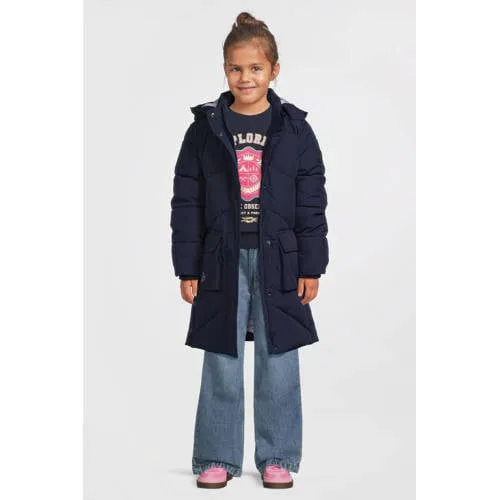 Deze lange hooded puffer jas voor meisjes van Me & My Monkey is gemaakt van polyester en heeft een afneembare capuchon. Het model sluit met een ritssluiting en drukknopen en heeft twee steekzakken met drukknoopsluiting aan de voorkant. Aan beide zijkanten zitten drukknopen voor extra bewegingsvrijheid. De jas is gewatteerd en uitgevoerd in het paars, met een lichtpaarse voering als subtiel kleuraccent. Op de linkerarm zit een logo en aan de binnenkant bevindt zich een ritszak voor extra opbergruimte.Details over deze jas:capuchondrukknopen beide zijden onderkantlogo linkerarm