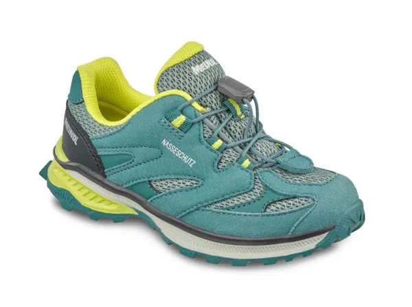 Deze Meindl Velas Junior is de ideale partner voor jonge avonturiers die niet bang zijn voor een beetje modder of een stevige wandeling. Het is een sportieve, multifunctionele wandelschoen die uitblinkt in comfort en gebruiksgemak.Hier zijn de belangrijkste kenmerken van deze schoen: Belangrijkste EigenschappenNässeschutz (Vochtbesherming): Zoals de tekst op de zijkant al verklapt, is de schoen voorzien van een speciaal membraan dat de voeten droog houdt bij nat gras of lichte regen, terwijl de schoen toch goed blijft ademen.Snelvetersysteem: Geen gedoe met losraakende veters. Met de handige stopper kunnen kinderen hun schoenen in een handomdraai zelf strak trekken en weer losmaken.Optimale Grip: De stevige profielzool biedt uitstekende grip op verschillende ondergronden, van bospaden tot schoolpleinen.Robuust & Lichtgewicht: De combinatie van suède en ademend mesh zorgt voor een schoen die tegen een stootje kan, maar niet zwaar aanvoelt aan de voet.Uitneembaar Voetbed: Handig om de maat te controleren (Best-Fit systeem) en om de zooltjes te laten luchten na een actieve dag.Ideaal voor:Dagelijkse wandelingen en buitenspelen.Lichte hikes in heuvelachtig terrein.School- en scoutingactiviteiten. KleurstellingDeze uitvoering komt in een frisse petrol/turquoise kleur met opvallende neon-gele (citroen) accenten, wat de schoen een moderne en stoere uitstraling geeft.