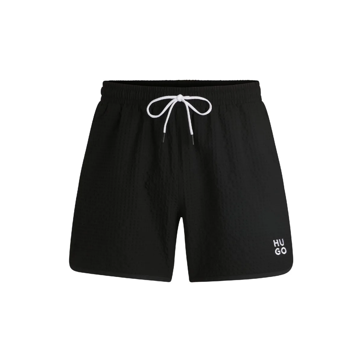 Mens HUGO Chaffle Waffle Fabric Swim Shorts with Stacked Logo in blackIn naturally quick-drying material with a modern structure these HUGO Menswear swim shorts are a suitcase essential. Embroidered stacked logo adds contrast. – Drawstring- Elastic waistband- Medium length- Waffle fabric- Side slash pockets- Rear welt pocket – Embrioded logo on the leg – Straight leg.- Length 38cm (Size M)- Main material: 50% Elastomultiester 50% Polyester. Lining: 100% Polyester. Machine washable.- Ref: 50540152-001