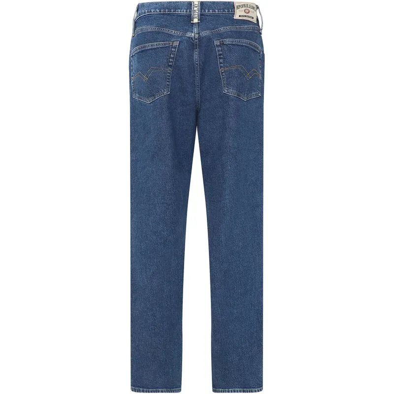 Mens Replay 9zero1 Straight-Fit Jeans in blue.- Button fly.- 5 pocket design.- Belt loops.- Distinguished by whiskers and worn areas.- The back pockets have iconic gull-wing stitching and one pocket bears R embroidery.- One of the front pockets features a small branded insert.- Replay lettering loop and the branded tag on the back.- Straight fit.- 99% Cotton 1% Elastane.- Ref: M9Z1075952D007