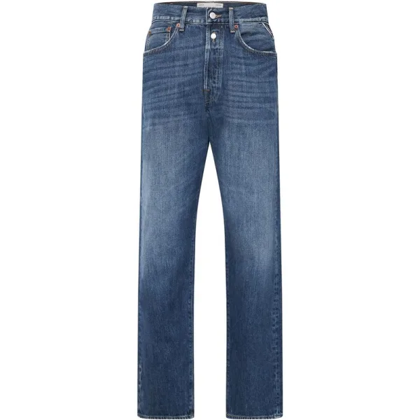 Mens Replay 9zero1 Straight-Fit Jeans in blue.- Button fly.- 5 pocket design.- Belt loops.- Distinguished by whiskers and worn areas.- The back pockets have iconic gull-wing stitching and one pocket bears R embroidery.- One of the front pockets features a small branded insert.- Replay lettering loop and the branded tag on the back.- Straight fit.- 100% Cotton.- Ref: M9Z10800721007