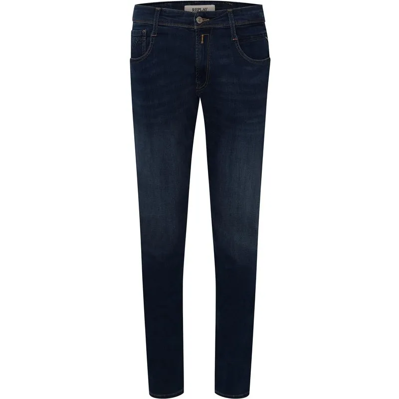Mens Replay Anbass Slim-Fit Jeans in blue.- Zip fly and button fastening.- 5 pocket design.- Belt loops.- Contrast stitching.- The back pockets have iconic gull-wing stitching and one pocket bears R embroidery.- One of the front pockets features a small branded insert.- Slim fit.- 90% Cotton 8% Polyester 2% Elastane.- Ref: M914Y41A874007
