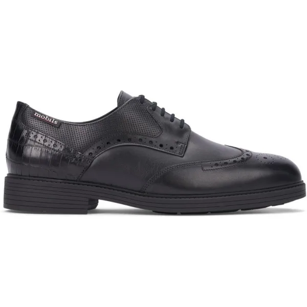 Uiterst comfortabele, nonchalante en elegante herenschoen, handgemaakt van hoogwaardig leer en geschikt voor zowel zakelijke als vrijetijdskleding. Opvallende details zijn de contrasterende leren hielkap in reptielenleer, de perforaties aan de zijkanten en het broguepatroon van een klassieke Budapest-schoen. Samen met de sterke, schokabsorberende zool accentueren ze de trendy look van deze derby. De innovatieve zooltechnologie MOBILS AIR-BAG SYSTEM zet nieuwe maatstaven op het gebied van grondprestaties en schokabsorptie voor hardlopers. In tegenstelling tot conventionele zolen is het gehele profiel van ons AIR-BAG SYSTEM voorzien van kleine flexibele cilinders aan de binnenkant. Deze cilinders buigen en comprimeren afzonderlijk om de harde impact van je voeten tijdens het hardlopen te absorberen en eventuele oneffenheden te compenseren. Dit verdeelt de druk gelijkmatig, zorgt voor een zachte en zekere stap en geeft je het gevoel alsof je op een luchtkussen loopt. Dankzij de SOFT-AIR-TECHNOLOGIE van MOBILS behoren pijnlijke voeten tot het verleden. De SOFT-AIR tussenzool minimaliseert de schokken bij het lopen. Het beschermt je voeten, ontlast je gewrichten, verzorgt je rug en bevordert een gezond milieu in je schoenen. Maximale hielbescherming wordt bereikt door de SHOCK ABSORBER