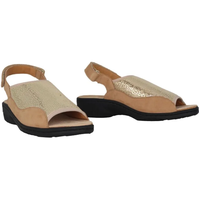 Dit model voor dames is gemaakt van stretchstof aan de voorkant van de voet en nubuckleer aan de zijkanten en achterkant van de voet. Gemakkelijk aan te trekken en comfortabel, deze sandaal zal aan al je wensen voldoen. De uitneembare binnenzool met SOFT-AIR-technologie en de buitenzool met SCHOKBREKER verminderen schokken tot een minimum en garanderen een soepele, moeiteloze wandeling. Het INTEGRALE MATRAS zorgt voor een perfecte pasvorm. De verstelbare klittenbandsluiting zorgt voor een uitstekende pasvorm. De voering van echt leer garandeert een hoge standaard van kwaliteit en comfort.