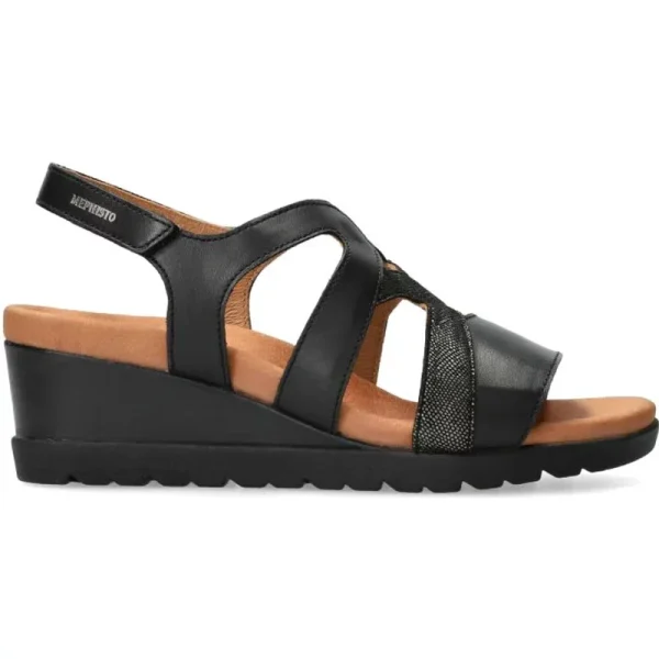 Vrouwelijk en elegant, deze wedge sandaal garandeert een ideale pasvorm. De leren voering zorgt voor een gezond klimaat in de sandaal. Dit zwarte model voor dames is gemaakt van glad leer over de gehele voet en glitterleer met metallic effect op de voorkant van de voet.