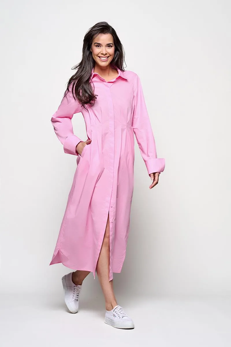 Lichtroze Merano jurk van Caroline Tensen – vrouwelijk silhouet met unieke detailsDe lichtroze Merano jurk uit de Caroline Tensen collectie is een elegante keuze die direct een stijlvolle touch aan je garderobe toevoegt. Deze doorknoopjurk valt op door haar flatterende pasvorm en vrouwelijke uitstraling. De verticale coupenaden in de taille, zorgvuldig verwerkt aan zowel het voor- als achterpand, volgen de natuurlijke lijnen van het lichaam en creëren een slank en elegant silhouet dat je figuur op de juiste punten accentueert.De klassieke kraag en de elegante knoopsluiting geven de jurk een tijdloze, verzorgde uitstraling. De lange mouwen zijn afgewerkt met manchetten en kunnen zowel strak gedragen worden voor een chique look als nonchalant worden opgerold voor een casual touch. Een bijzonder detail is het subtiele borduursel op de rug met twee vogels en een hartje – een persoonlijke signatuur van Caroline Tensen die verwijst naar haar tatoeage en de jurk een unieke, liefdevolle touch geeft.De lichtroze Merano jurk is veelzijdig te dragen en ideaal voor uiteenlopende gelegenheden, van een feestelijke avond tot een stijlvolle dag in de stad.