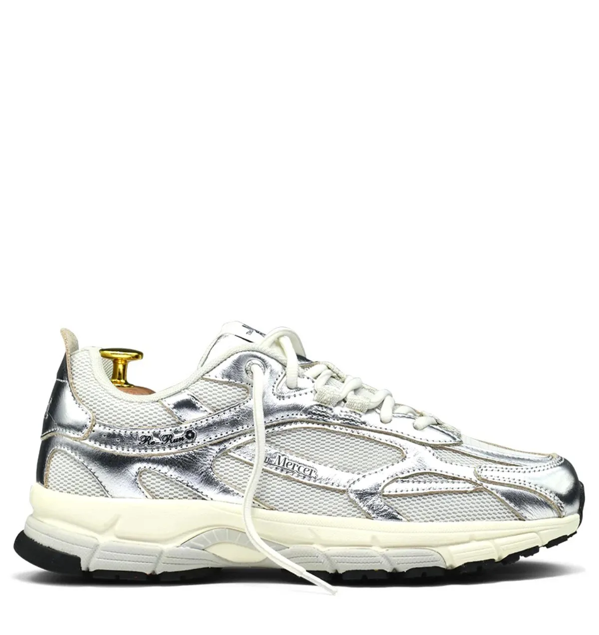 Een uitgesproken runner met een lichte en sportieve feel. De The Re-Run Pine ME261019-996 damessneaker van het Mercer Amsterdam is gemaakt van off-white meshmateriaal en zilverkleurig getrommeld leer. De gerecyclede polyester voering en het uitneembare voetbed zorgen voor comfortabel draaggevoel. De gerecyclede rubberen EVA-zool in