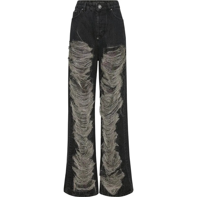 Mesh Strass Denim Trousers Skater Fit Ripped Prijzen