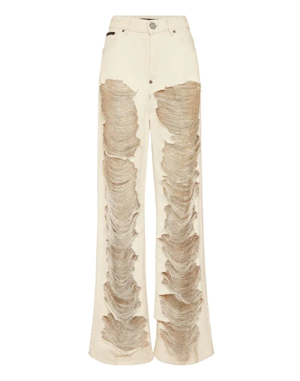 Mesh Strass Denim Trousers Skater Fit Ripped