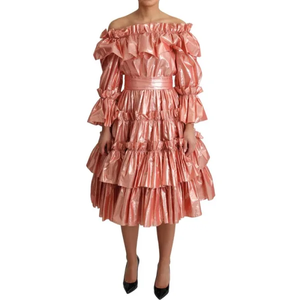 Maak een statement, draai hoofden en bezit de ruimte. Deze metallic midi jurk zorgt ervoor dat jij de aandacht trekt op elke speciale gelegenheid. De luxe metallic roze stof creëert een betoverende uitstraling, terwijl de off-shoulder halslijn een vleugje glamour toevoegt. De dramatische gelaagde ruffles die langs de rok vallen, zorgen voor een flatterende silhoeët. Romantische driekwartmouwen ronden het ontwerp af. De midi lengte voegt elegantie toe. Alleen stomen.