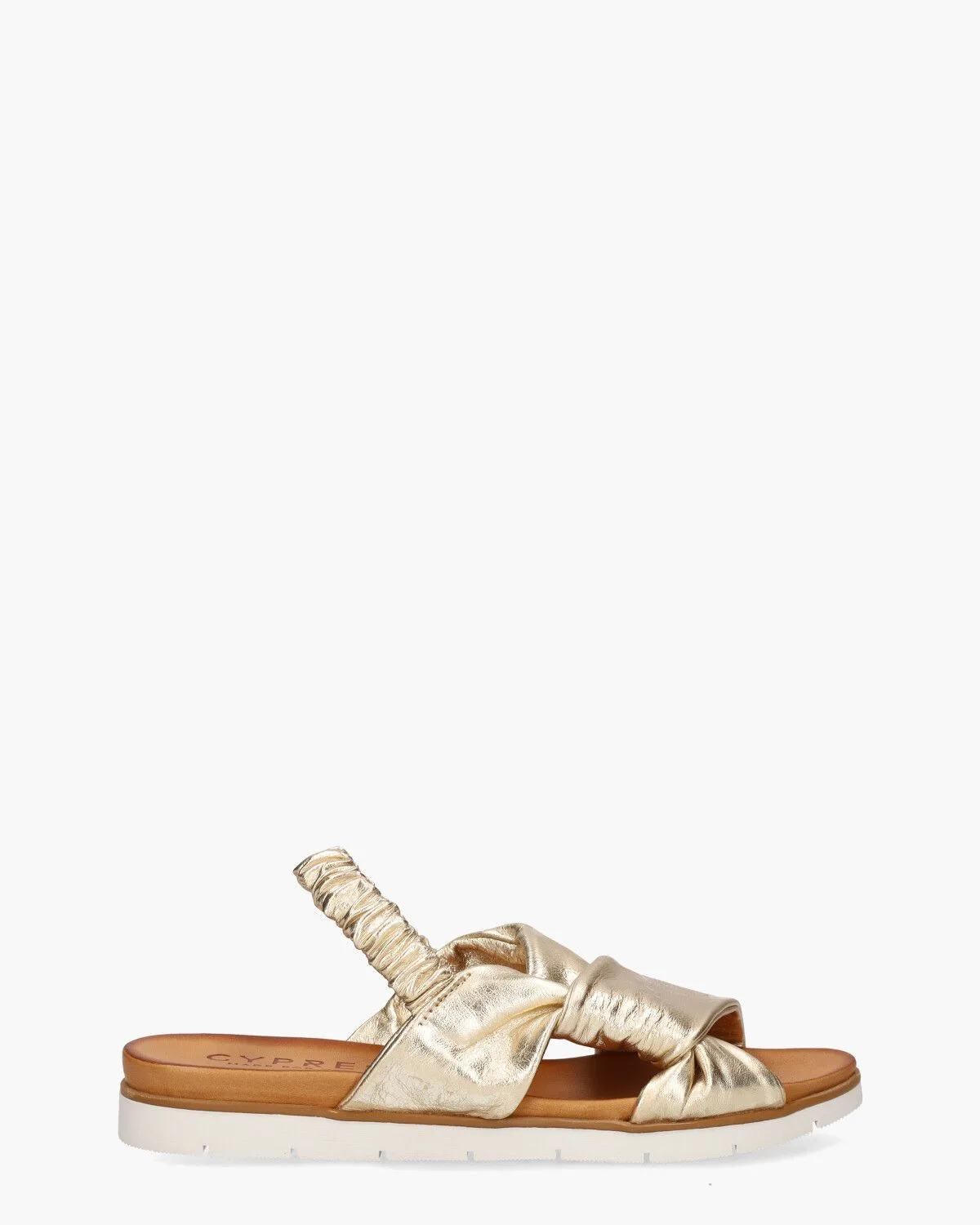 Sandaal voor dames Rubina van het merk Cypres. Deze slides hebben een upper van gestructureerd leer in een metallic goudkleurige tint. De puffy gedraaide banden geven dit model een casual look. Het licht voorgevormde voetbed is in leer uitgevoerd. De gouden plissé hielband is elastisch waardoor de sandalen een goede pasvorm hebben. De 2 cm