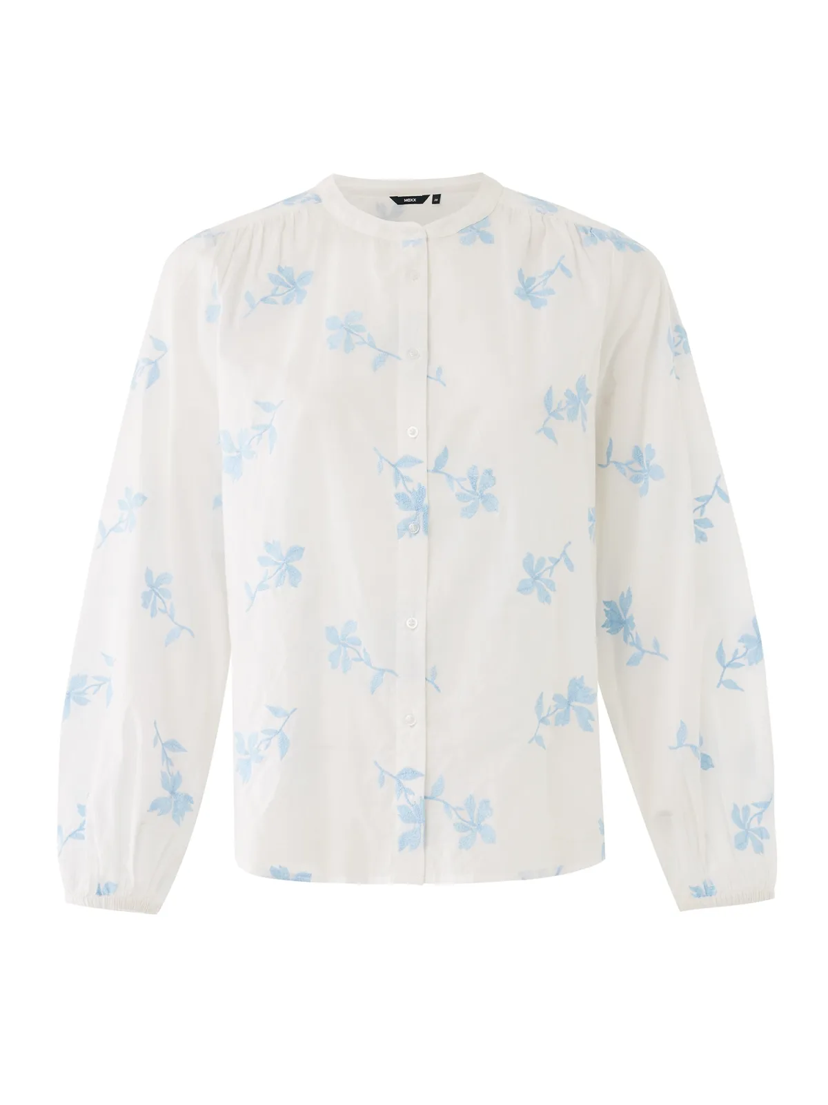 Blouse type: Klassieke blouse; Design: Knop placket, Pofmouwen, Rugplooi, Ronde zoom; Type sluiting: Knoopsluiting; Materiaal: Katoen; Motief: Bloemenprint; Kraag: Zonder kraag; Details: Borduursels, Gedrapeerd; Extra's: All-over patroon, Op staal naden; Pasvorm: Normale pasvorm; Armlengte: Lange mouw; Lengte: Normale lengte