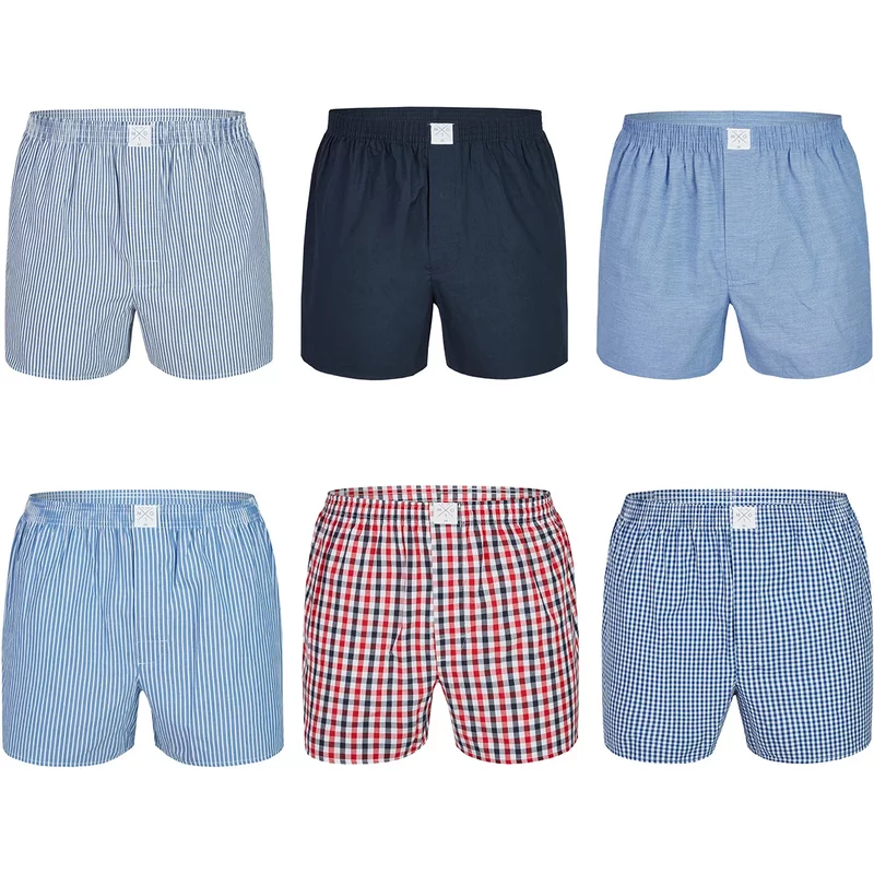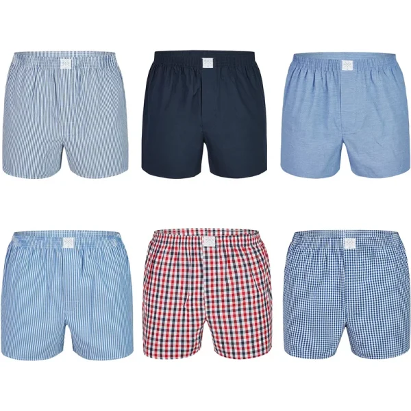 Comfortabele MG-1 wijde boxershort gemaakt van 100% katoen. De shorts zijn los en wijd. De zeer elastische, zachte tailleband zorgt voor weinig druk en is comfortabel om te dragen. De set bevat zes boxershorts in zes klassieke verschillende designs, variatie van geruit, gestreept en effen blauw.