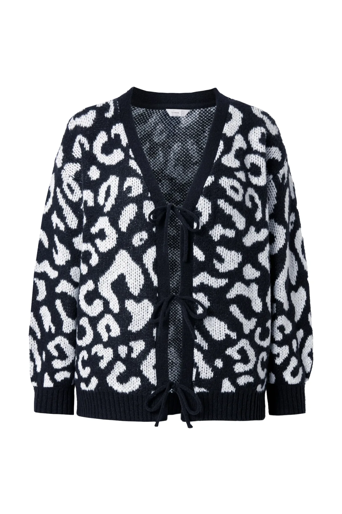 Design: Geribd ceintuurtje; Type sluiting: Snoersluiting; Materiaal: Knitwear; Halstype: V-hals; Motief: Dierenprint; Extra's: Label patch/label flag; Pasvorm: Normale pasvorm; Armlengte: Lange mouw; Lengte: Normale lengte