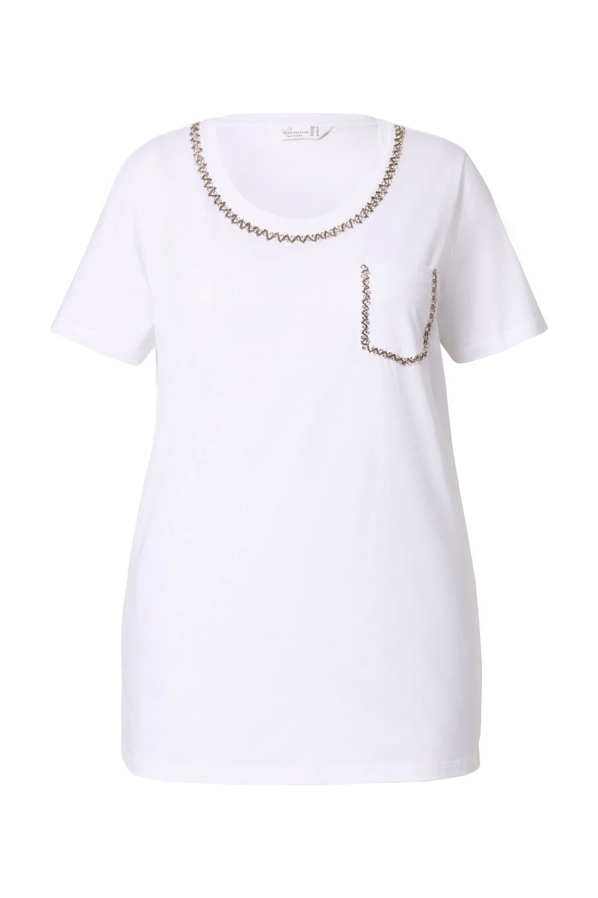 Design: Gevoerde zoom/rand; Materiaal: Jersey; Halstype: Ronde hals; Motief: Effen; Details: Borduursels, Sierstenen; Extra's: Glitterend; Pasvorm: Normale pasvorm; Armlengte: Kwartmouw; Lengte: Normale lengte