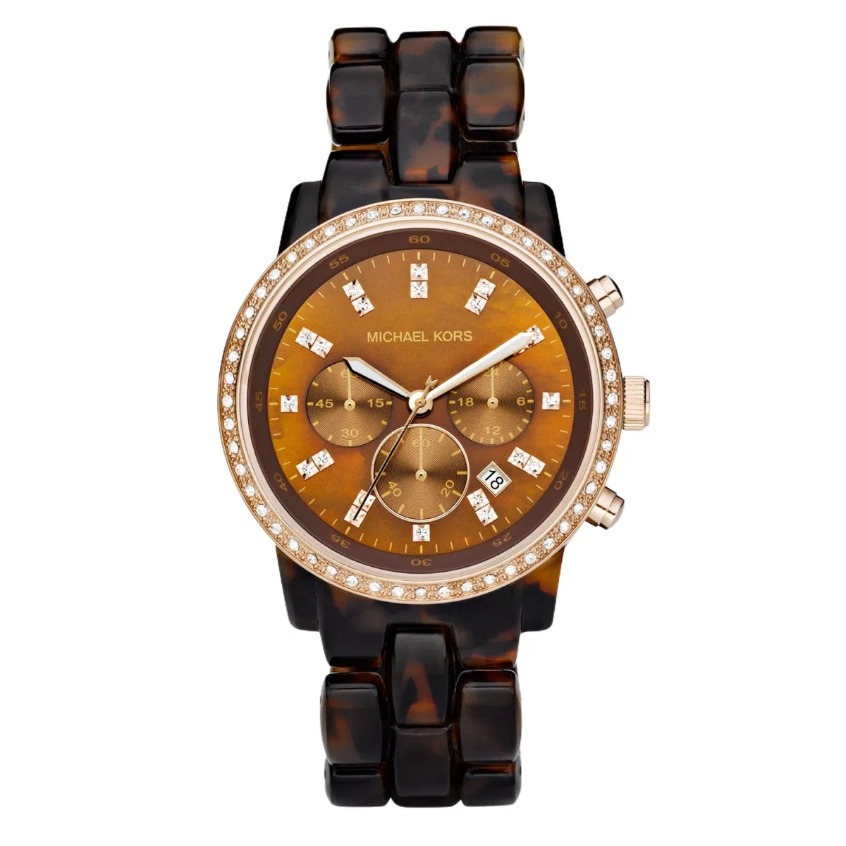Michael Kors Dameshorloge Kwarts Bruin• Materiaal kastdeksel: Hars• Soort glas: Mineraal• Materiaal Band: Hars• Kleur kast: Bruin• Waterdichtheid: 100 m (10 ATM)• Diameter: 43 mm