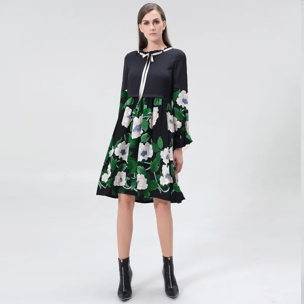 Een statement-stuk, deze blouse-dress heeft een royale wijd uitlopende gesneden, lange mouwen met gezwollen manchetten, een lintornament op de kraag. Een vloeiende lijn, zowel modern als weinig retro met zijn bloemprint, deze jurk kan worden gecombineerd met platte laarzen voor een casual look of met hakken voor een verfijnde lijn. Een fris en vrouwelijk item dat je garderobe energie zal geven. Gemakkelijk, ademend en rimpelvrij polyester flanel. Productdetails : Vorm: uitlopende, A-lijn Lengte: 95 cm Lange mouwen Ronde nek met lintknoop Onzichtbare rits aan de zijkant