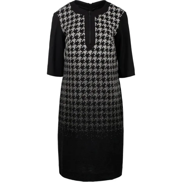 Deze midi-jurk is uitgevoerd in gebreide jacquard ombré dogtooth print. Hij heeft elleboogmouwen en een rits aan de voorkant. De jurk heeft een recht silhouet en is gevoerd.