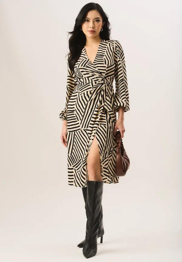 Deze beige midi-jurk met asymmetrische zoom en overslag met geoprint is een perfecte mix van stijl en verfijning. Het wikkelsilhouet geeft een gevoel van moderniteit aan je garderobe, terwijl de asymmetrische zoom een vleugje drama toevoegt, geschikt voor elke gelegenheid. Deze midi-jurk is gemaakt van hoogwaardige stof en mag zeker niet ontbreken in je garderobe.