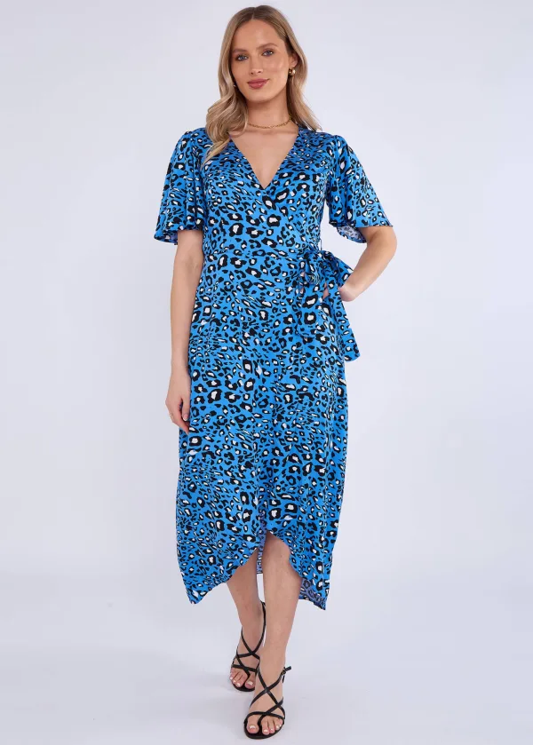 Laat je van je wilde kant zien met onze Blue Animal Print Viscose Wrap Midi Dress. Deze jurk is gemaakt van lichtgewicht, zachte viscose en heeft een flatterend wikkelontwerp en een trendy dierenprint. Perfect voor elke gelegenheid, voeg deze jurk toe aan je garderobe en onderscheid je moeiteloos van de massa.