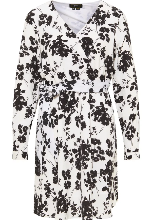 Deze creatie van faina staat voor pure glamour. Het halflange model is gemaakt van een zacht, vloeiend materiaal en heeft een wikkelachtige bovenkant. De vrouwelijke bloemenprint is een blikvanger die goed tot zijn recht komt in contrasterende tinten. De lange mouwen zijn afgewerkt met een smal manchet. Het model is nauwsluitend dankzij de elastische taille, die wordt geaccentueerd met een bindceintuur. Draag de gevoerde jurk met je favoriete pumps of als avondkleding met bijpassende hoge hakken.