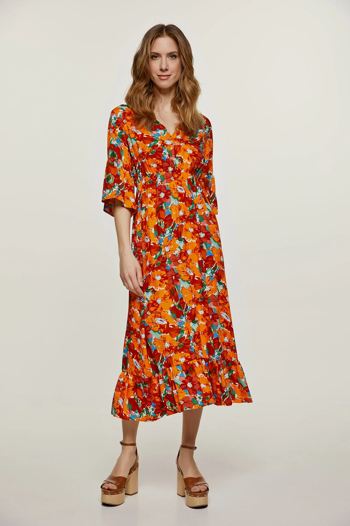 Midi jurk met bloemmotief en ruches