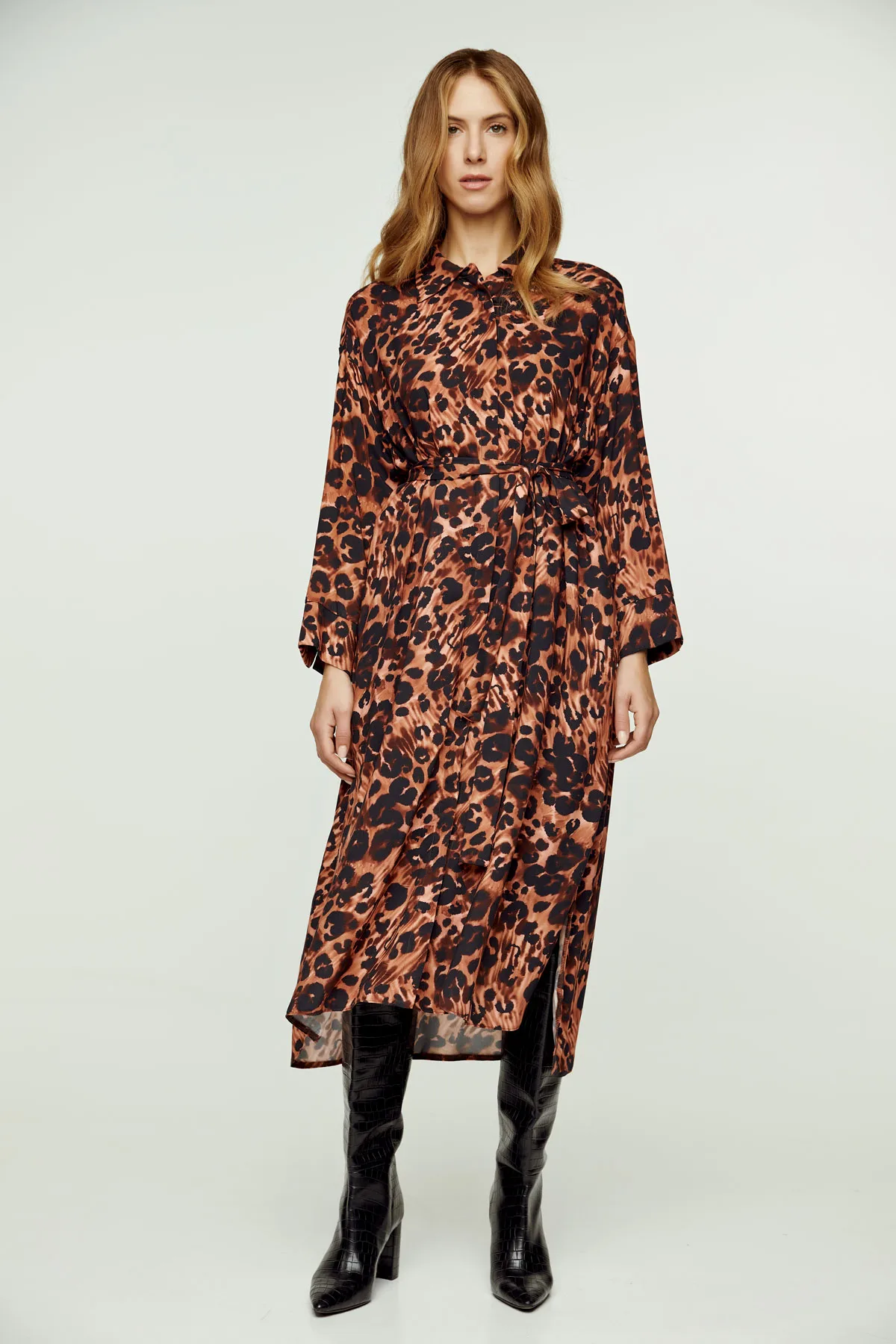 Deze midi-jurk met dierenprint is gemaakt van geweven viscose. Het heeft een kraag en een blinde sluiting die vooraan met plastic knopen wordt gesloten. De mouwen zijn 7/8 lang met manchetten in dezelfde stof en splitjes aan de uiteinden. De jurk heeft hangende schouders. Er is een optionele ceintuur in dezelfde stof. De zoom is afgerond met lange splitten van 40 cm aan de zijkanten.