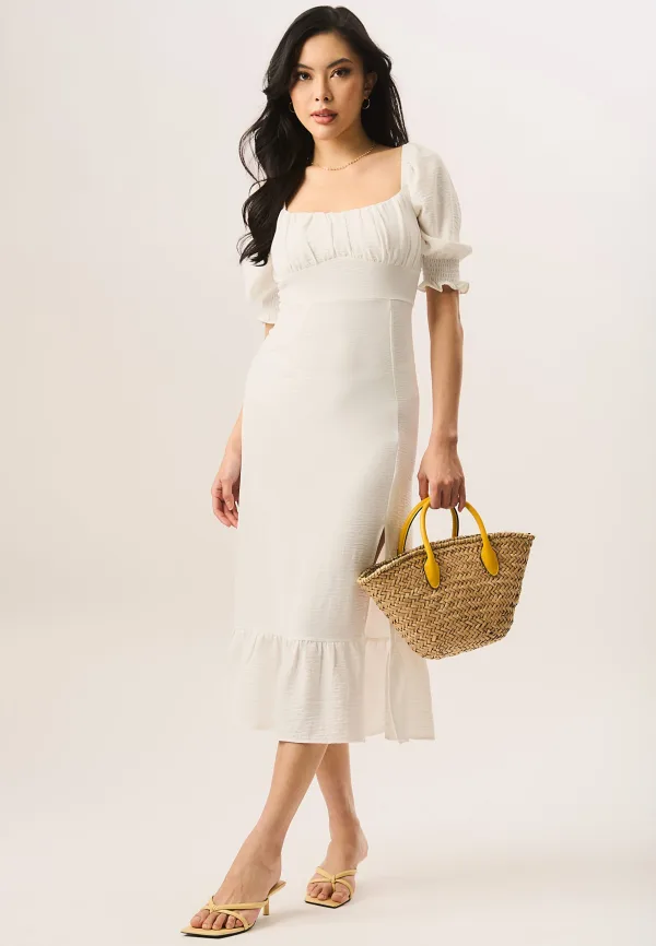 Geef je garderobe een boost met onze witte midi-jurk met pofmouwen en splitzoom. Deze jurk heeft een strakke, frisse witte kleur en flatterende geplooide mouwen en straalt een moeiteloze stijl uit. Deze midi-jurk is perfect voor elke gelegenheid en zorgt ervoor dat je er chic en modieus uitziet.