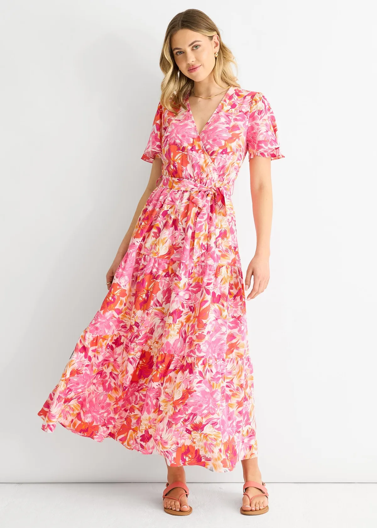 Deze midi-jurk heeft een prachtig rood bloemendessin waarmee je opvalt in elke menigte. De overslagstijl en de ceintuur in de taille zorgen voor een flatterend silhouet, terwijl de midilengte een vleugje verfijning toevoegt. Deze jurk is perfect voor elke gelegenheid en een must-have voor je garderobe.